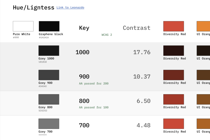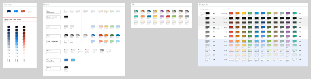 Для организации цветов используется двухуровневая система токенов. Второй уровень токенов организован по принципу выделения групп цветов, обеспечивающих нужный уровень контраста между собой.