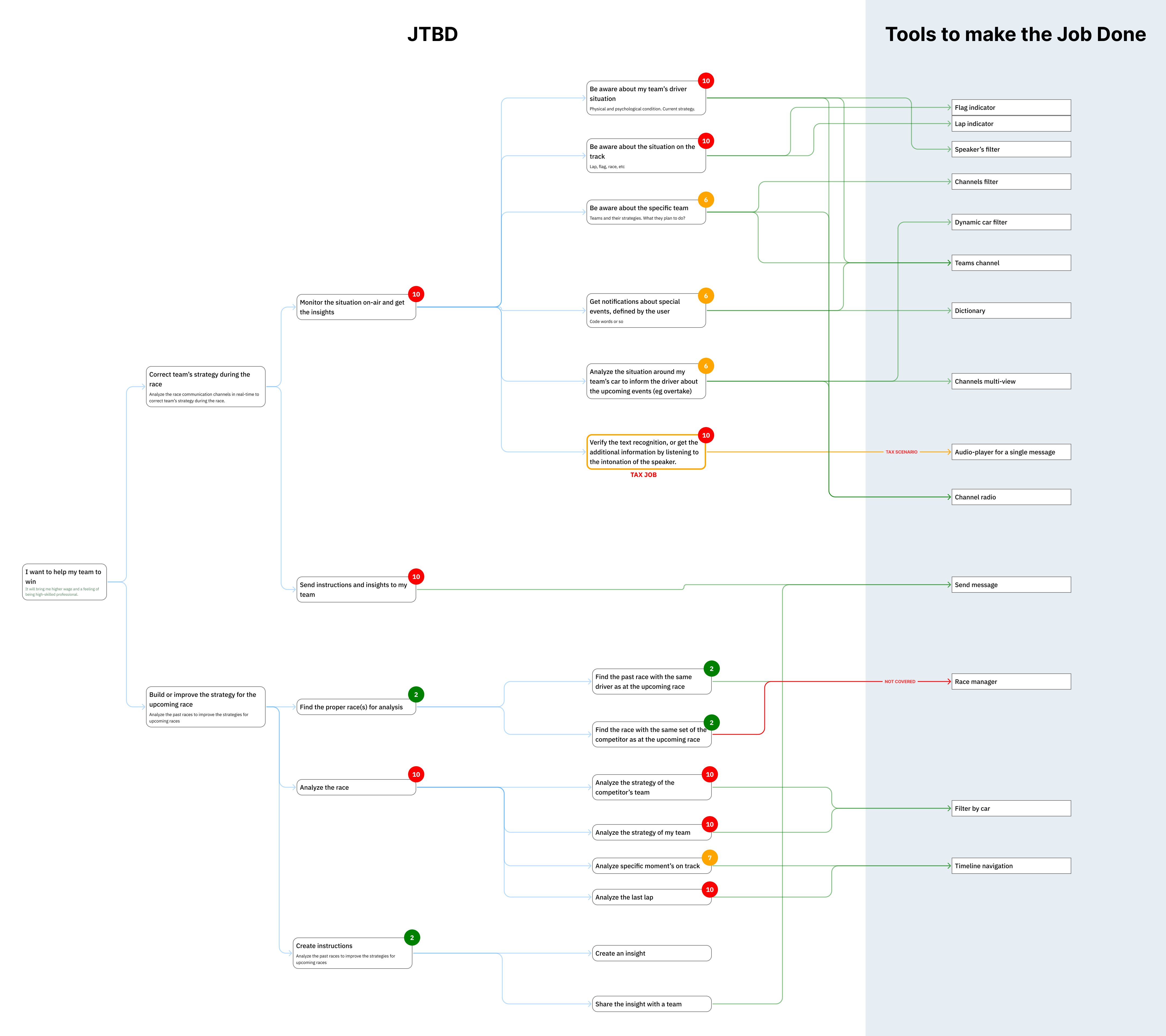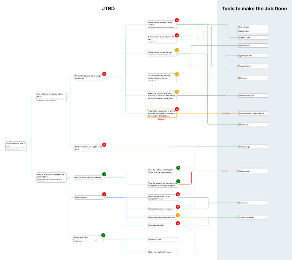 В левой части — JTBD с детализацией от крупных целей до мелких задач. В правой части — функции программы, закрывающие эти задачи. Маркеры рядом со ценариями и задачами обозначают их приоритет для пользователя. Цвета коннекторов обозначают налоговые и не закрытые сценарии.